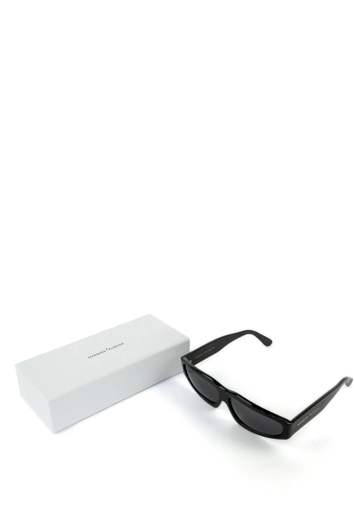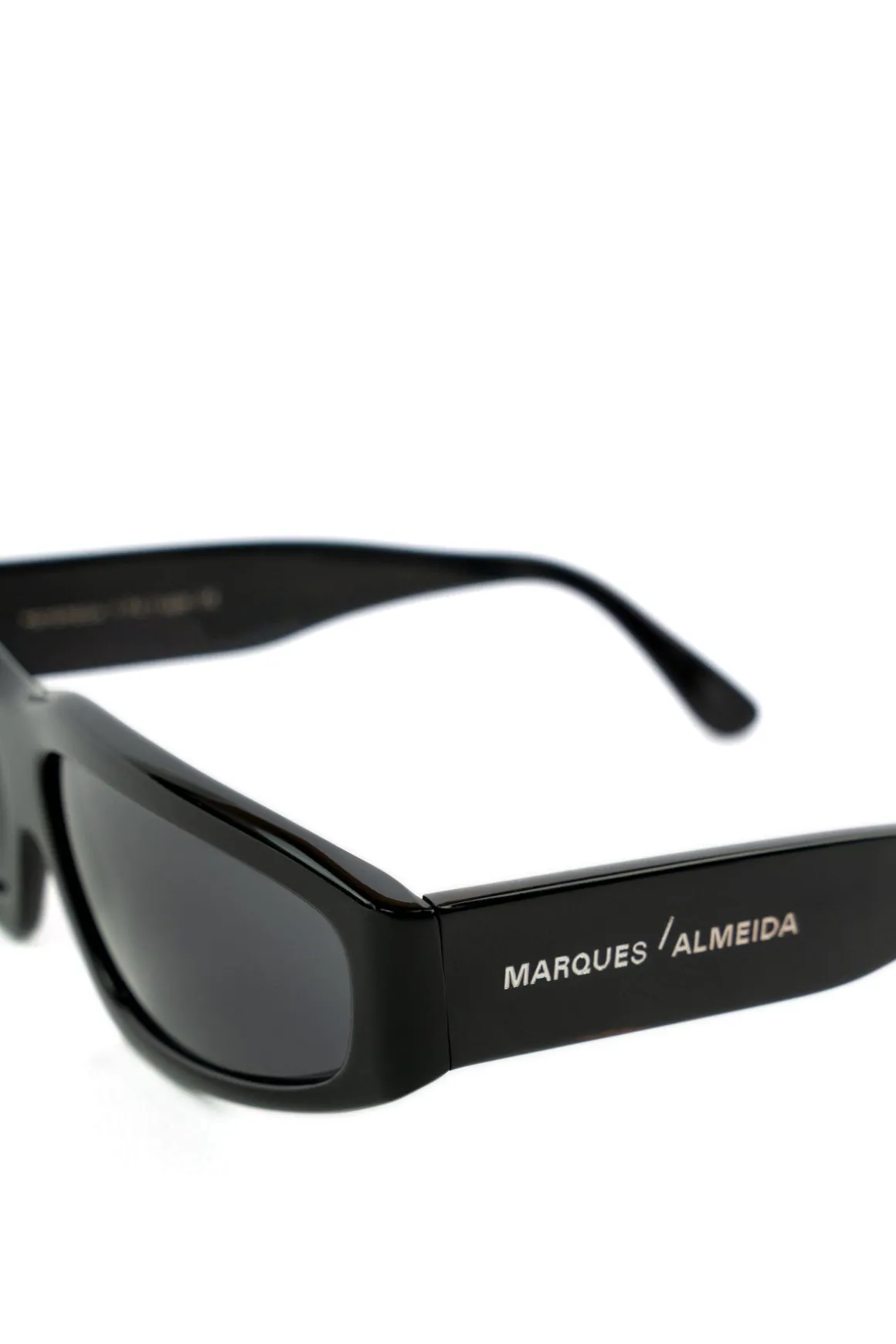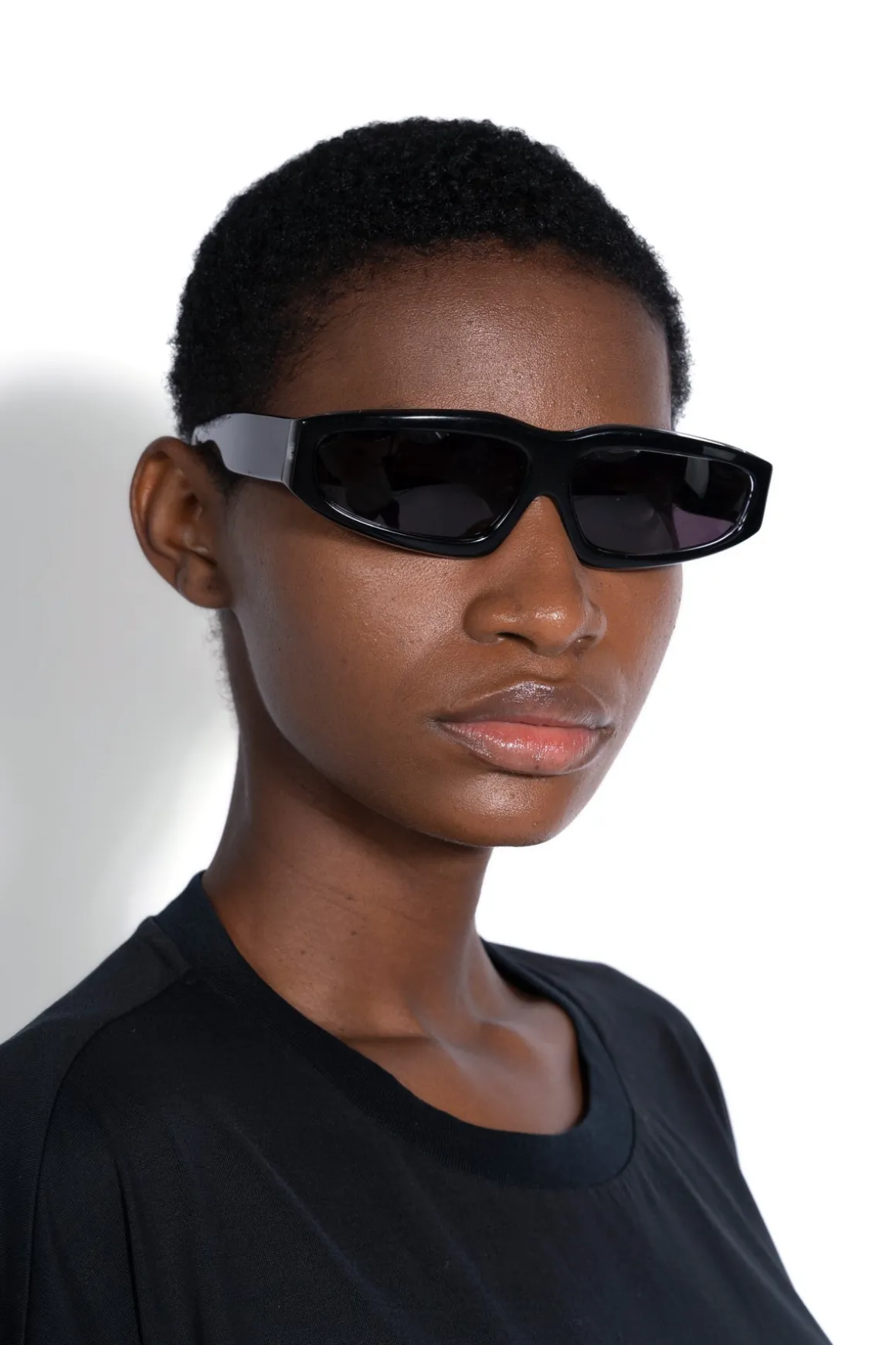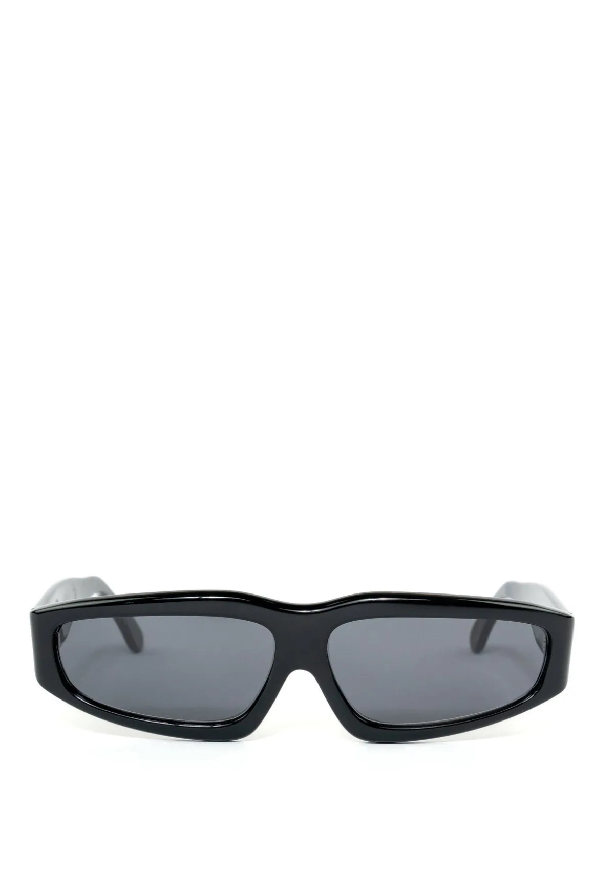 Angular shades with a black frame, shadowy lenses and a flashy silver debossed logo on the sides.
