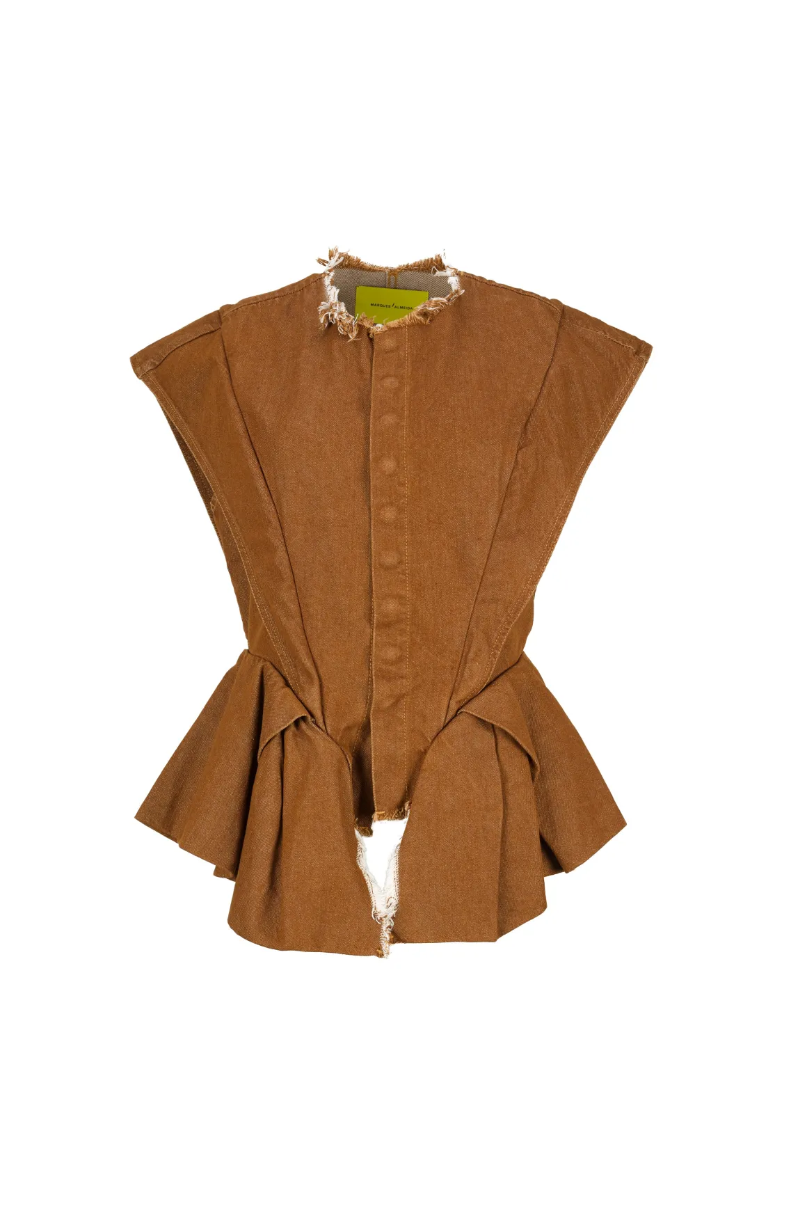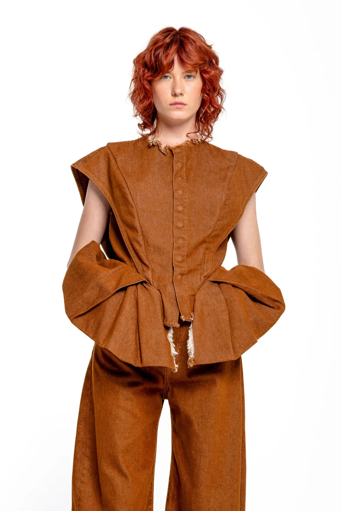 Transform your wardrobe with our Brown Denim Top! Featuring structured shoulders, front buttons, a cinched waist and hip frills, this sleeveless top is the perfect blend of fashion and functionality. Elevate your look and embrace the versatility of this must-have piece today!