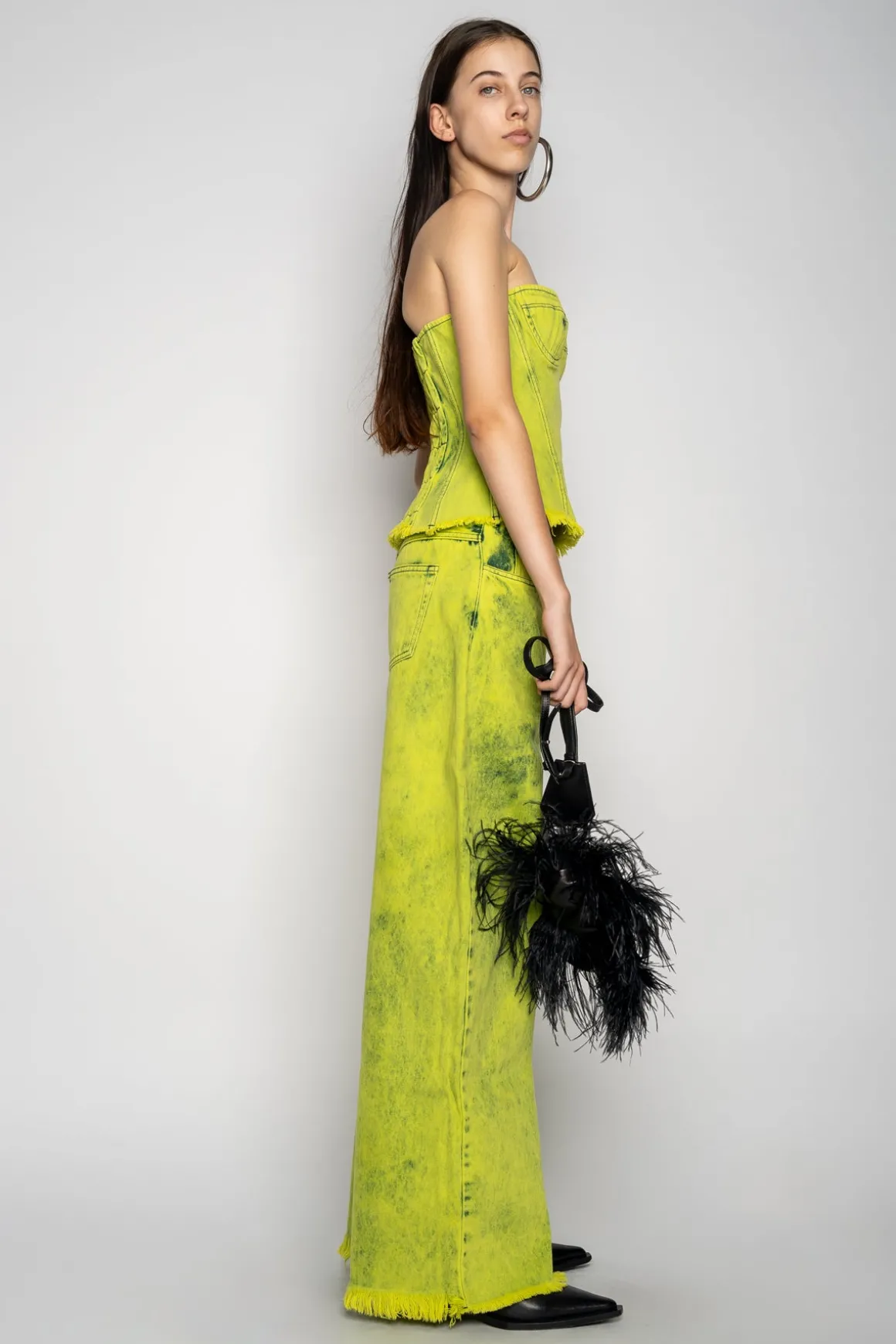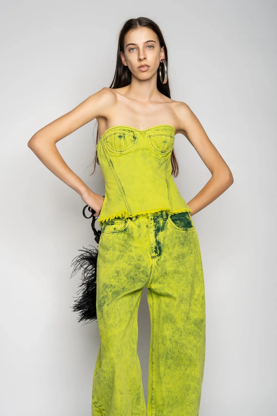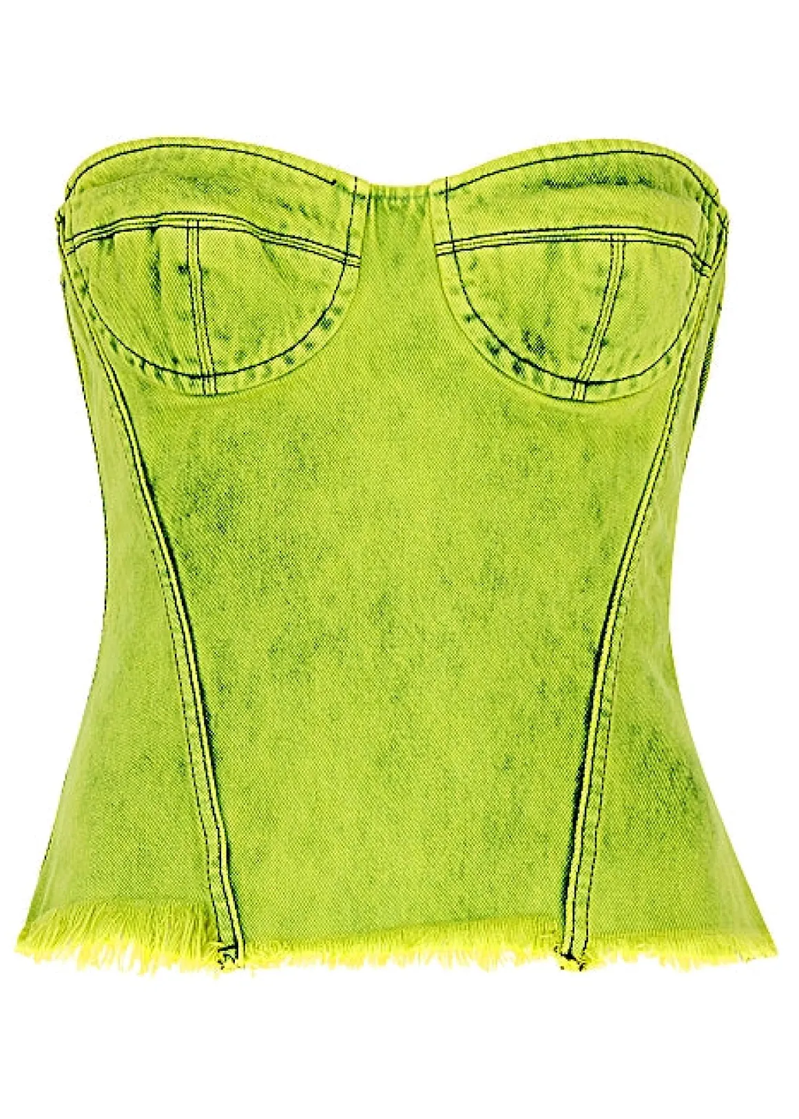 This lime-hued, acid wash denim corset delivers an alluring silhouette with boning and a side zip fastening. The elasticated back ensures a perfect fit with a pinch of stretch for ultimate comfort.