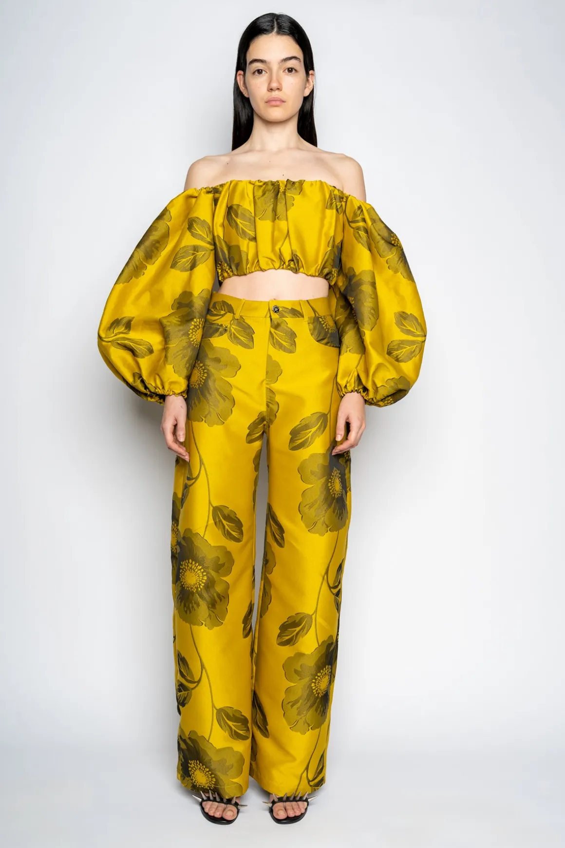 Introducing our mustard-colored trousers with a black floral brocade design. These pants boast a boyfriend silhouette, five functional pockets and a wide-leg shape.