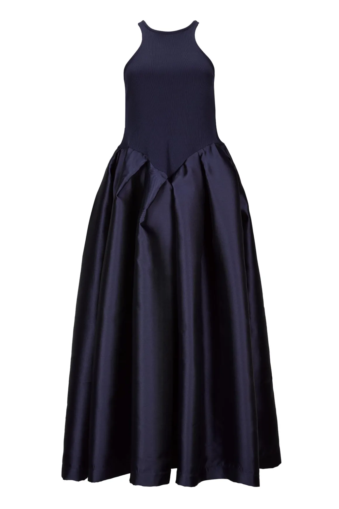 This dress captivates with a vibrant navy tank top in rib jersey and paired with a navy puff long skirt in mikado! Experience comfort like never before!