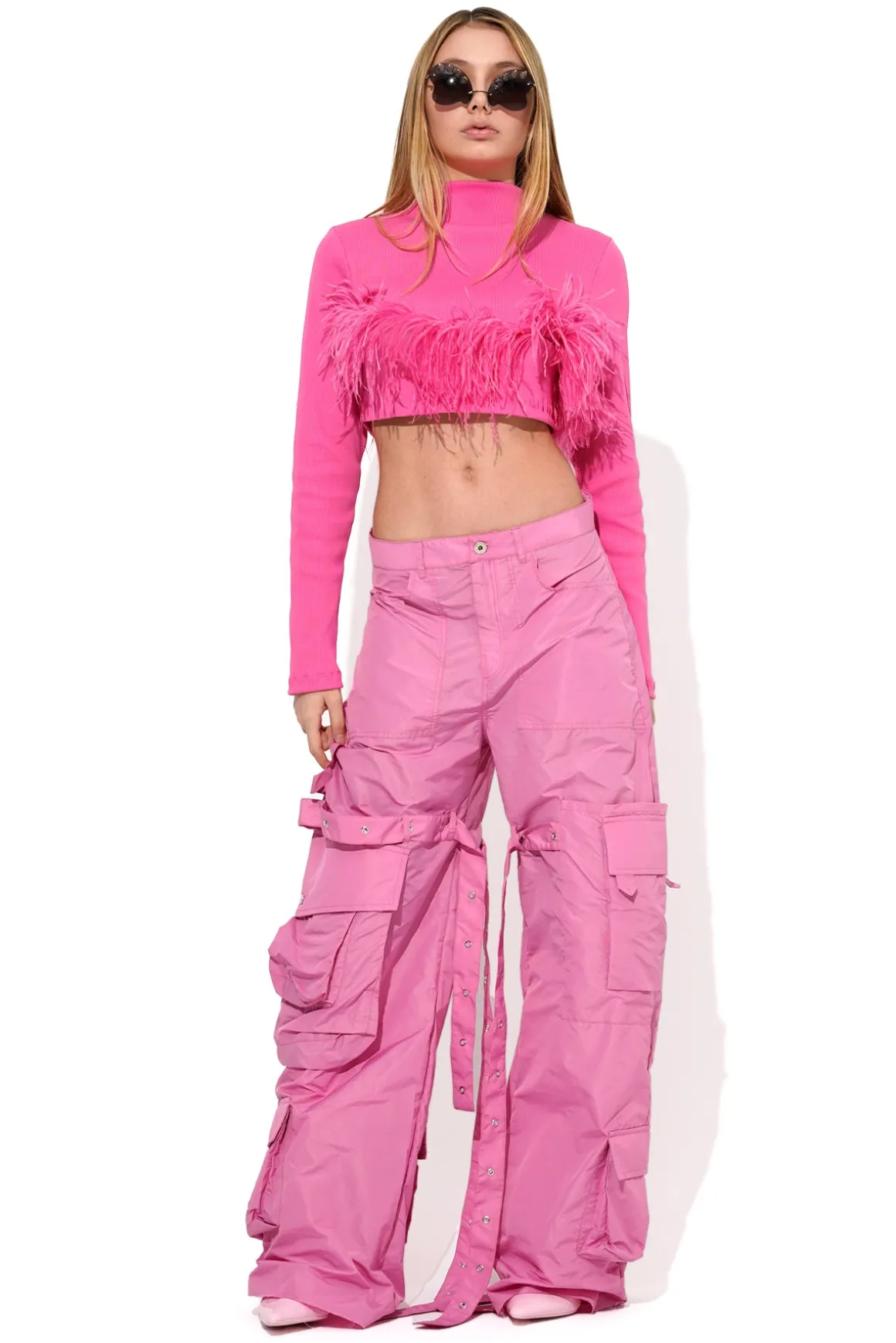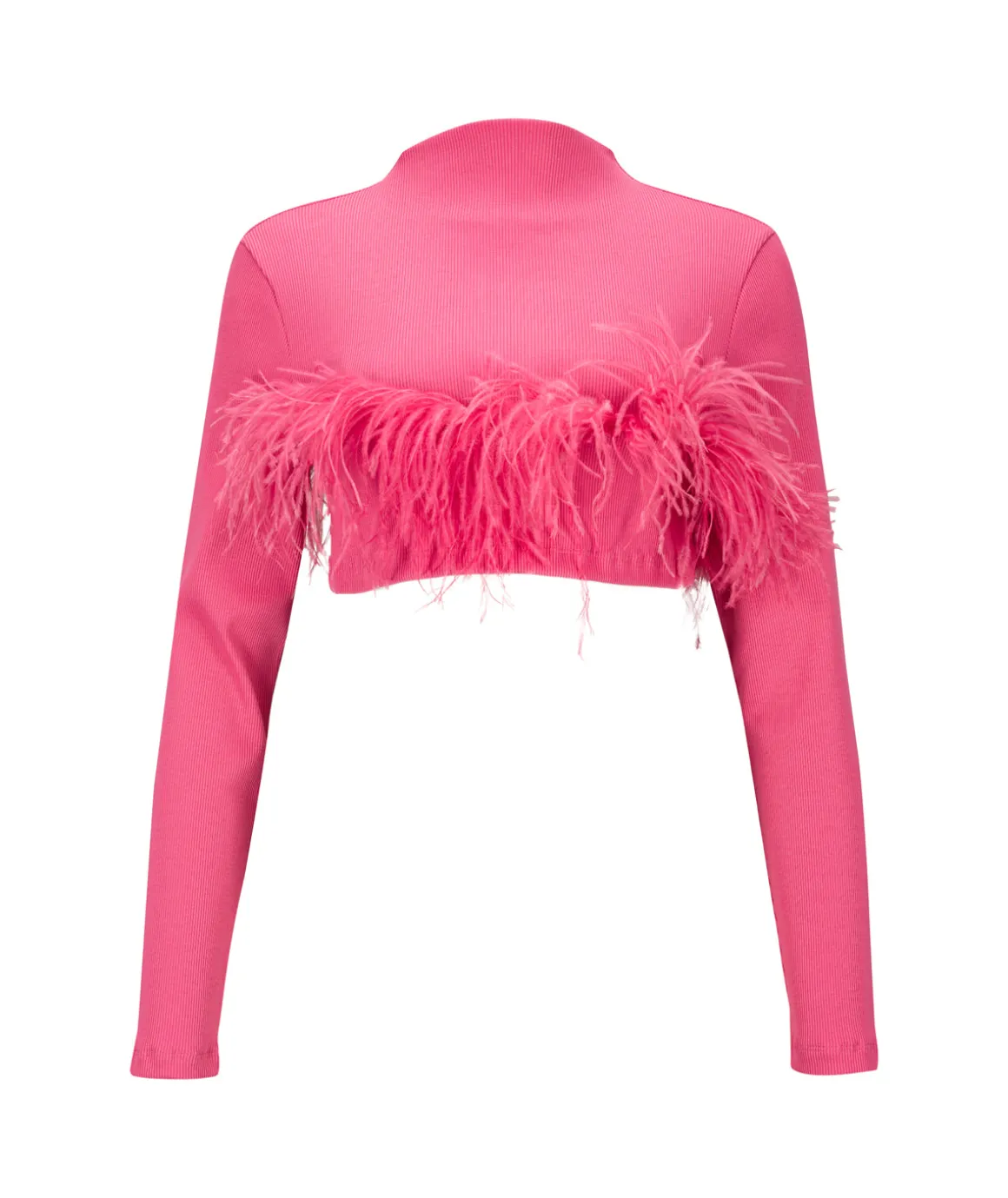 Feel the vibrant energy of this pink rib jersey cropped top featuring a high neckline, long sleeves and delightful pink feathers down the hemline.