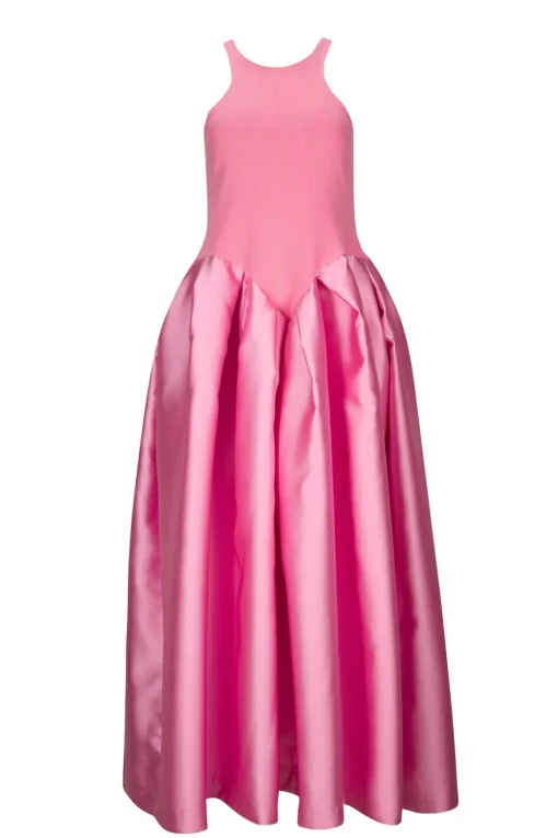 This dress is sure to capture attention with its rib jersey pink tank top and mikado pink puff long skirt.