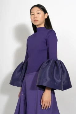 A purple top designed with a tailored fit, high collar and voluminous puff sleeves for a classic, stylish vibe!