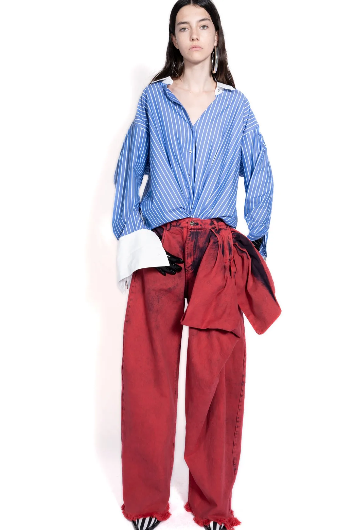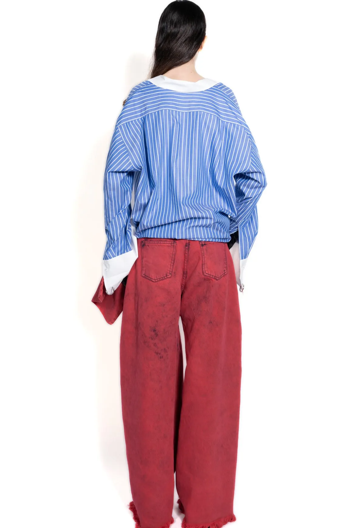 Introducing our Red Boyfriend Trousers With Big Bow – relaxed fit, dropped waist and high-rise make these wide-leg jeans your go-to for cool comfort. The oversized bow and the raw hems complete the look!
