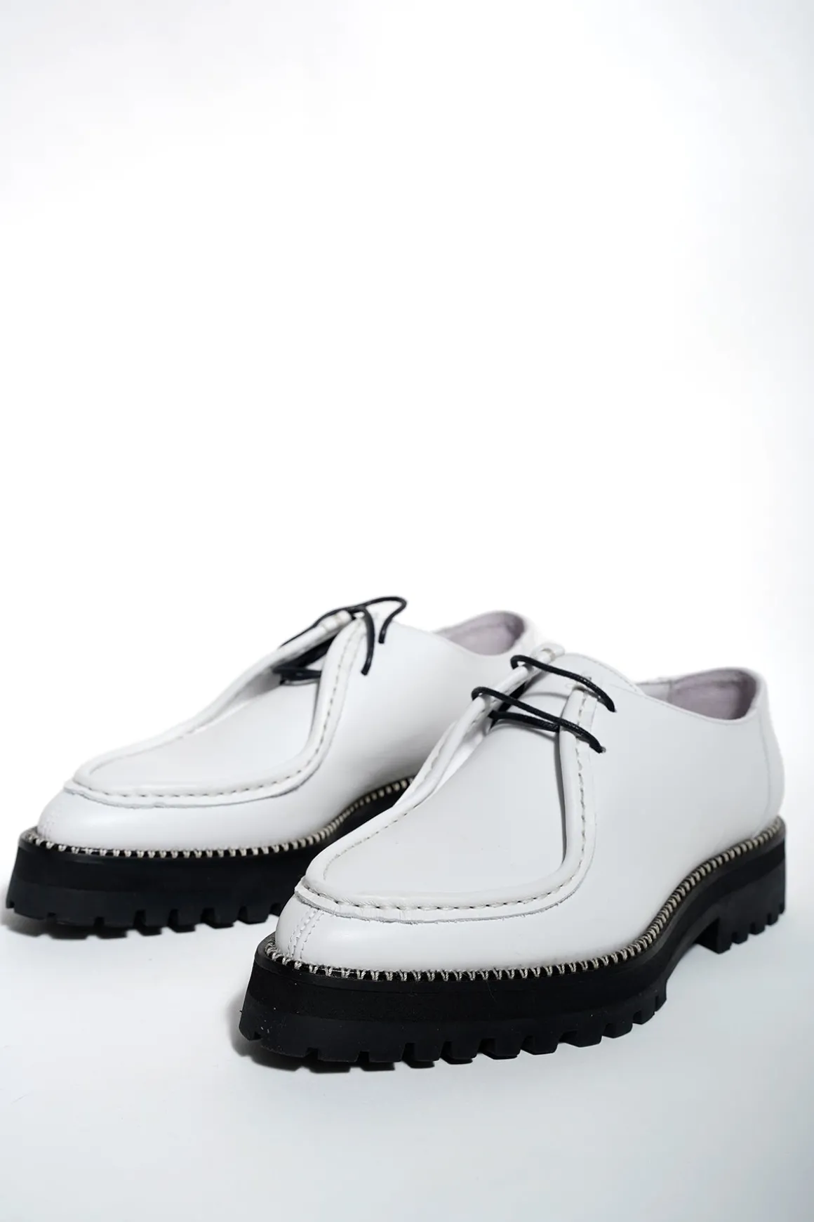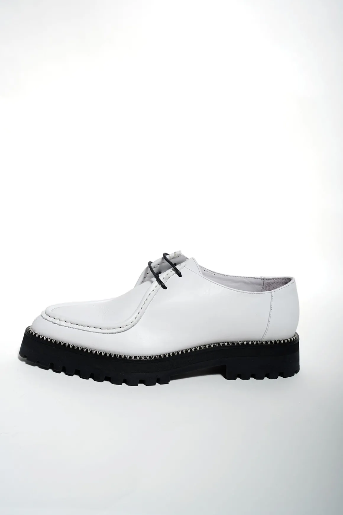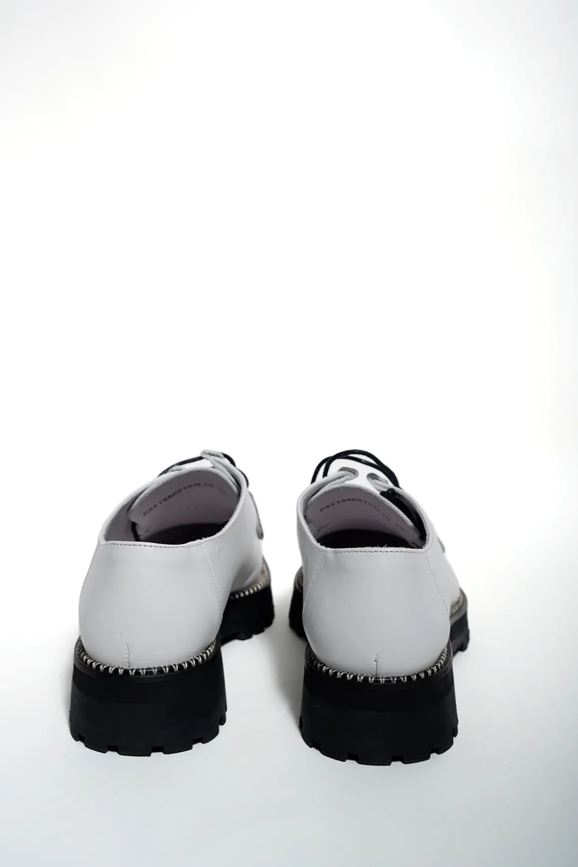 Step out in style with these chunky white leather brogues! Featuring a ridged black rubber sole, rounded toe, and lace-up front, you'll be ready to take on the day!