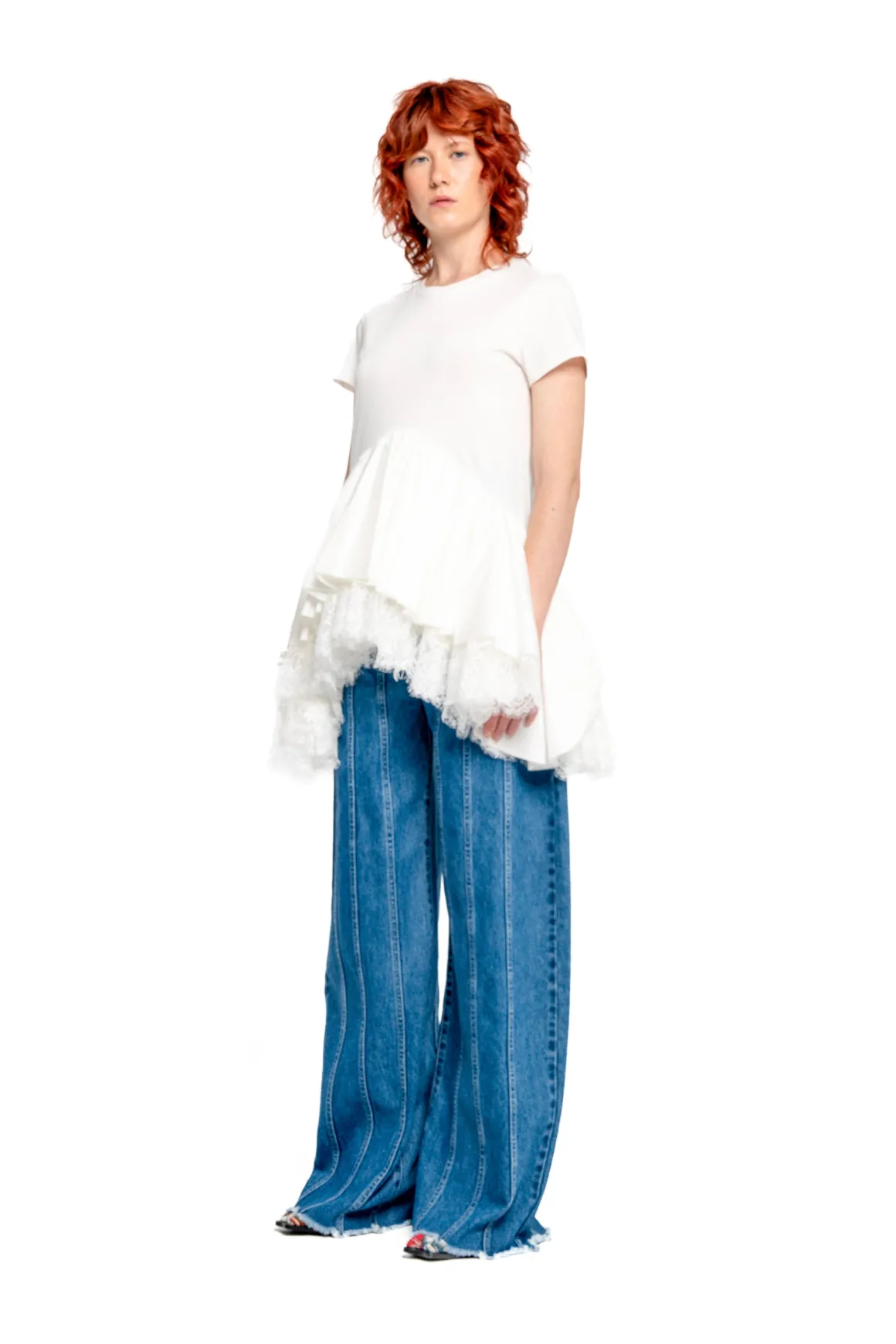 Indulge in the comfort of our cap sleeve t-shirt, made from soft white jersey cotton. Complete with a round neck, delicate bottom frill and lace hem, this shirt is the perfect addition to any wardrobe.